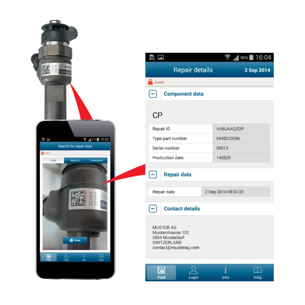 - Każda zregenerowana lub naprawiona część, która objęta jest programem Bosch QualityScan, otrzymuje unikalny kod, umożliwiający weryfikację jej autentyczności, identyfikację naprawy, dostęp do danych naprawy, oraz stanowi certyfikat jakości regeneracji wykonanej przez autoryzowany serwis Bosch Diesel.
